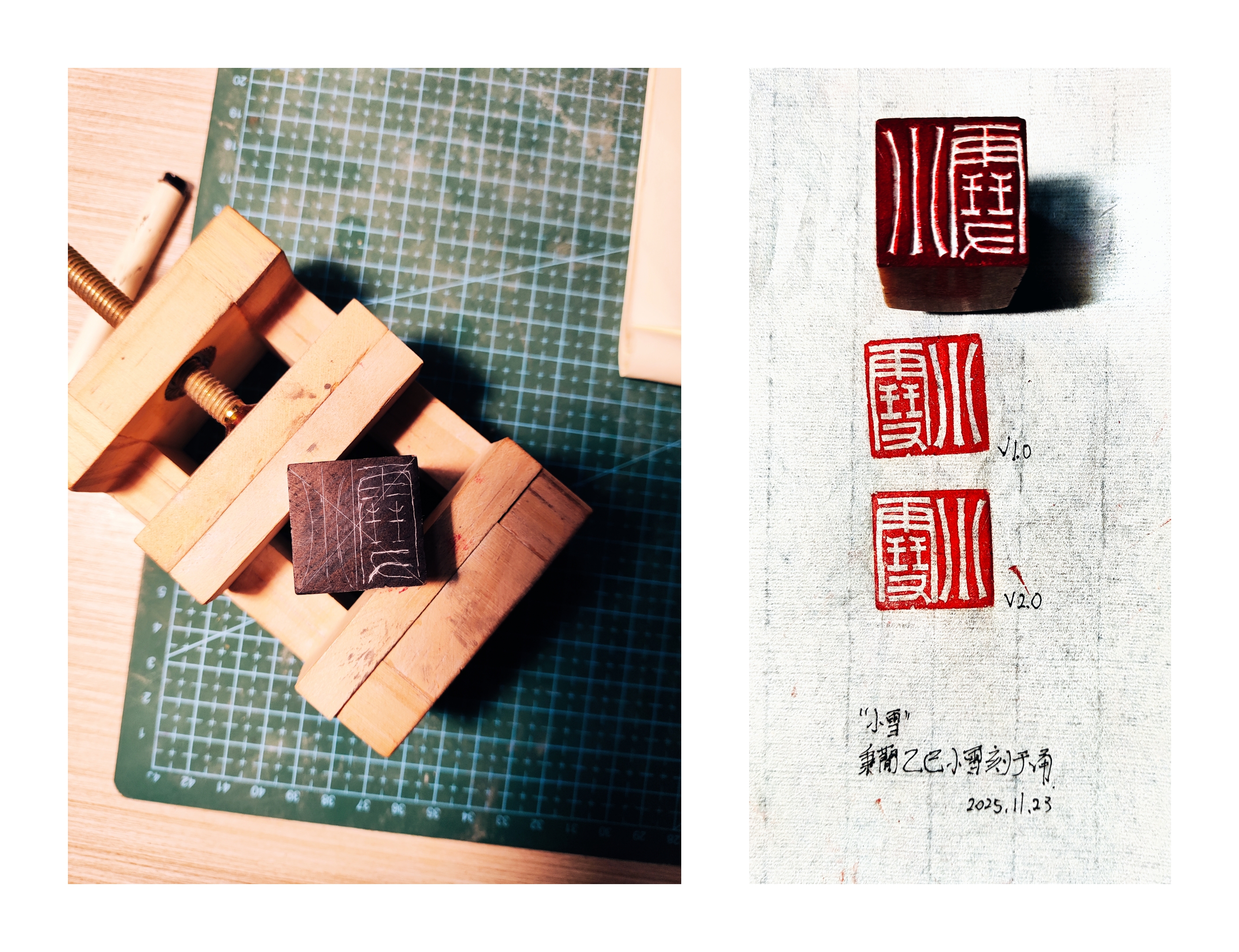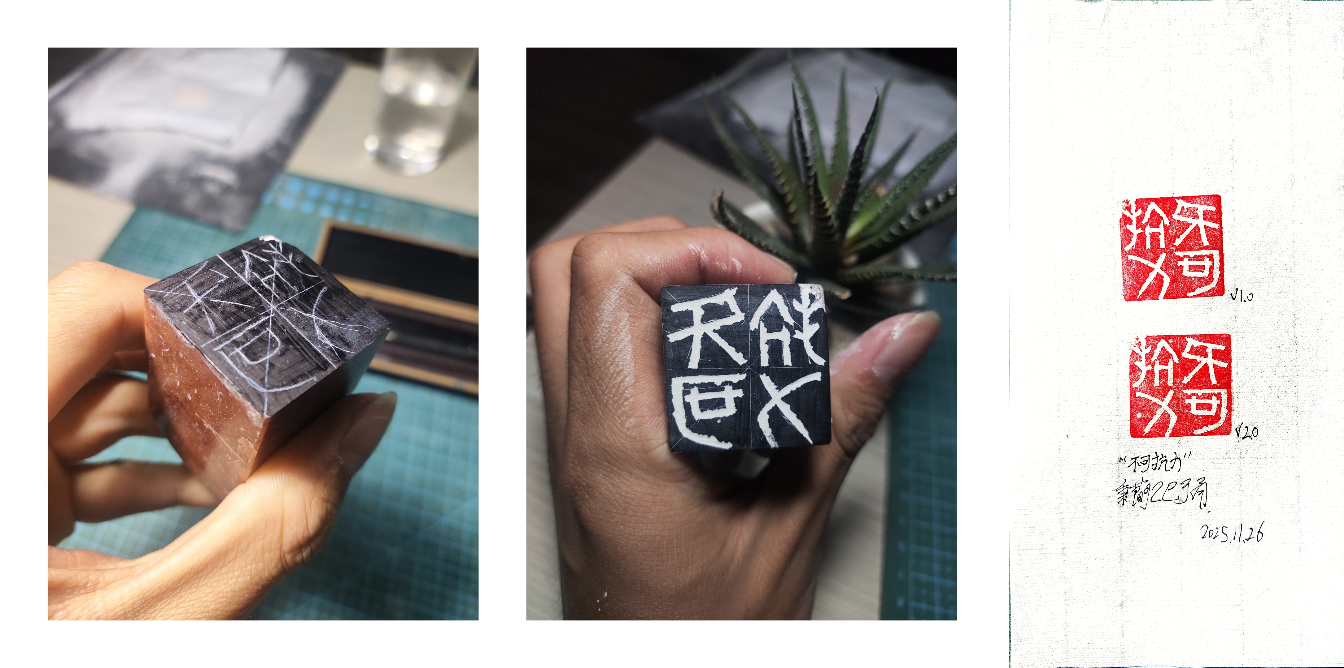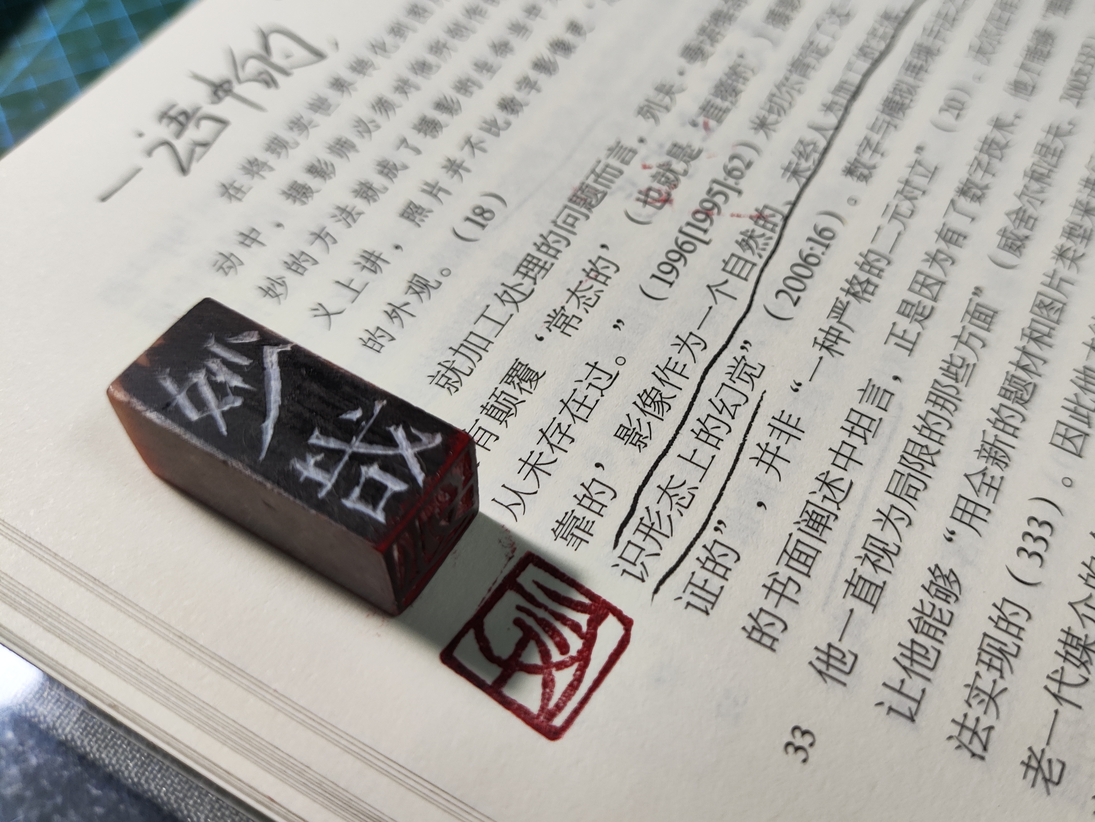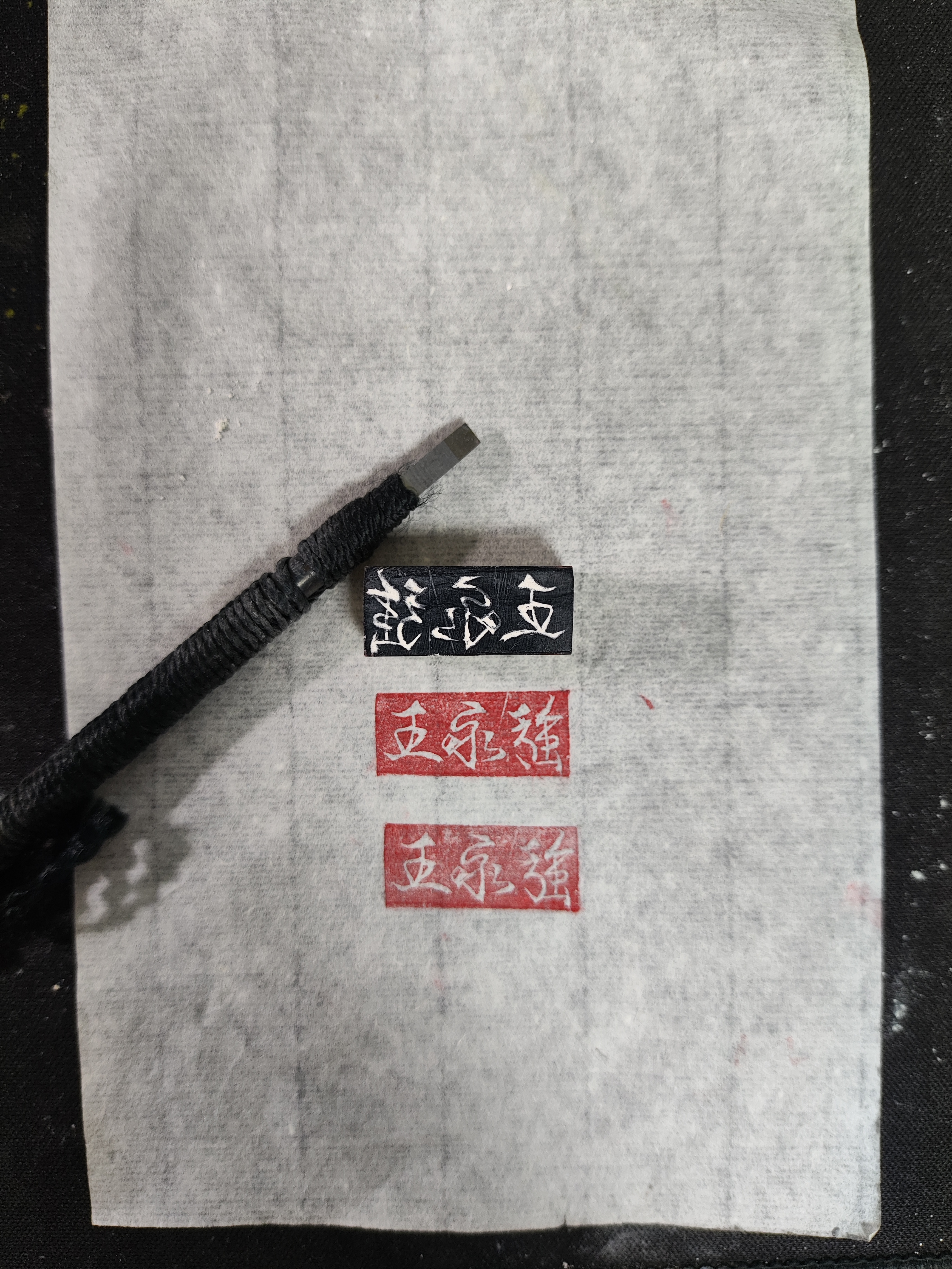 虽说内容(刀法)与样式(设计)完全融合,却所见非所得,结果要用印泥编译(铃印)出来。过程不能撤销,基本没有太多回旋余地,刻地好好的,印石一崩,刻刀一滑,说废就废。(不过我一般不予理睬,美其名曰“手工感💀”)