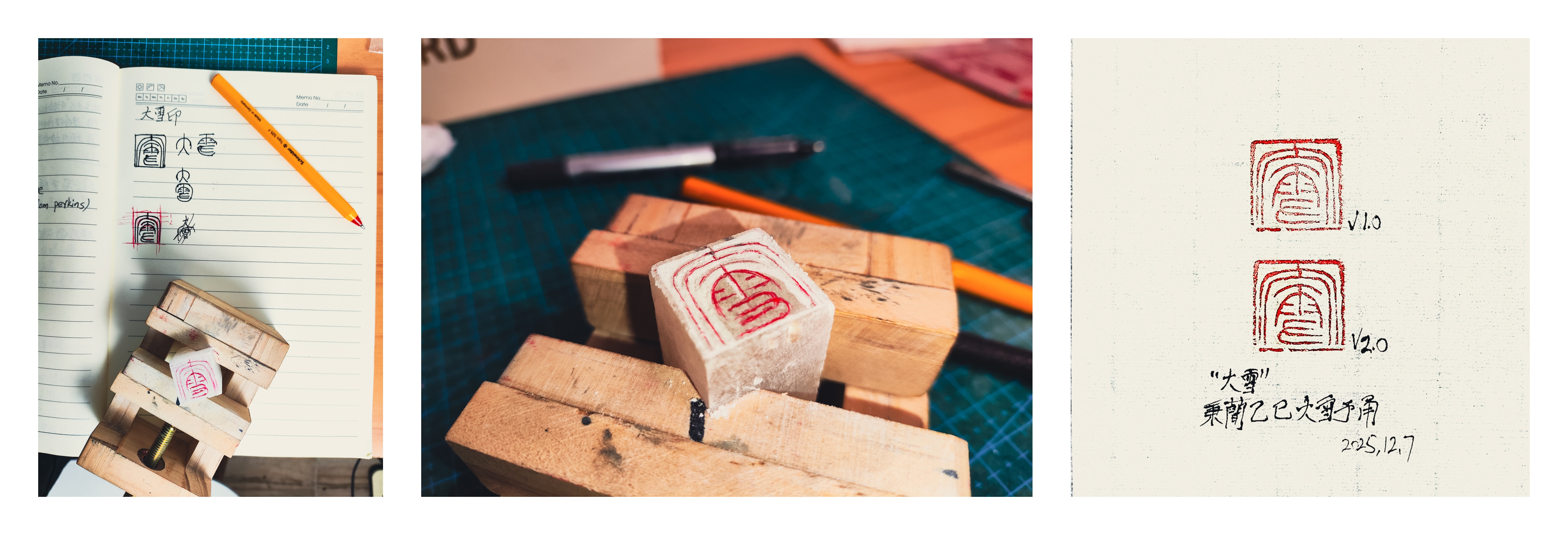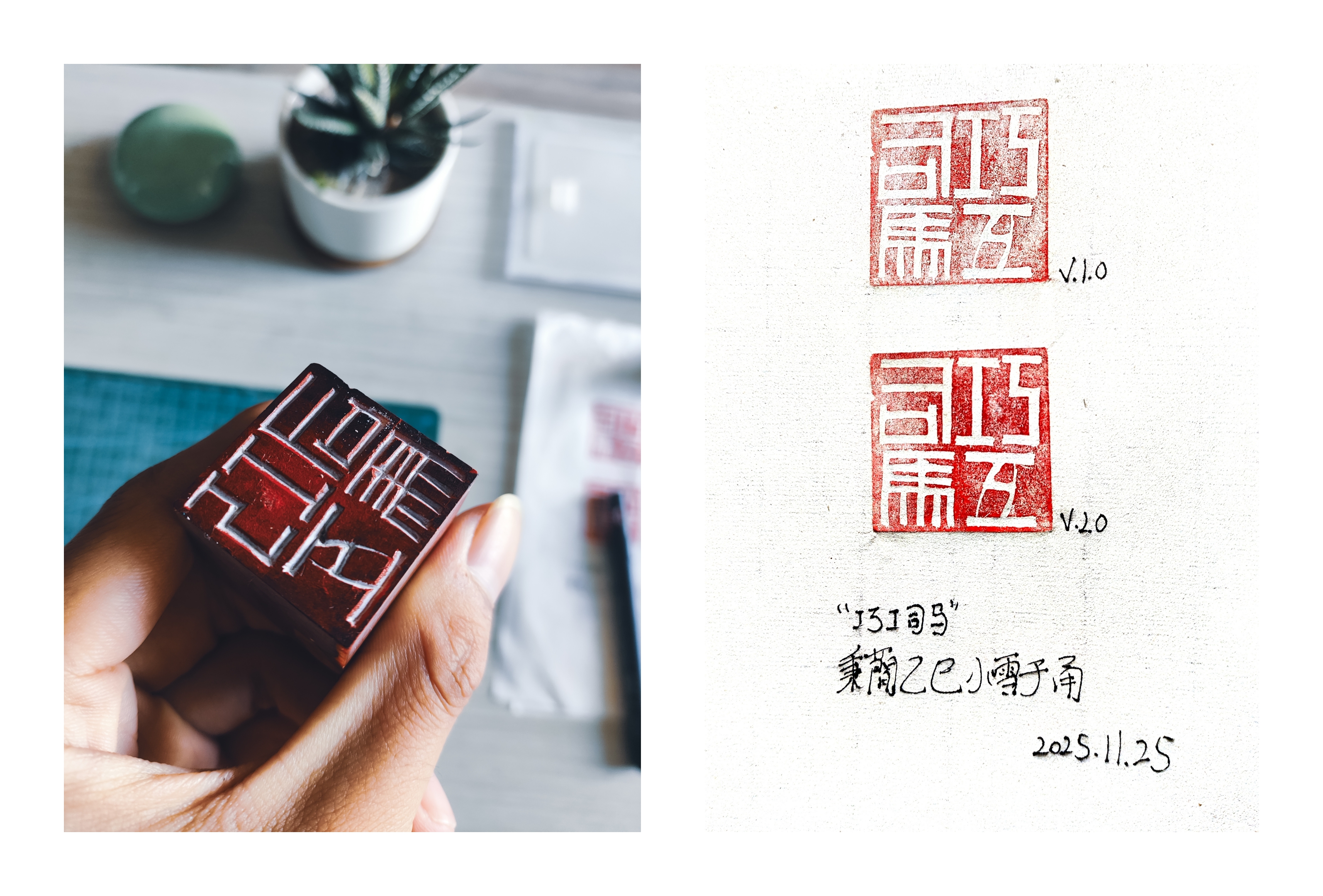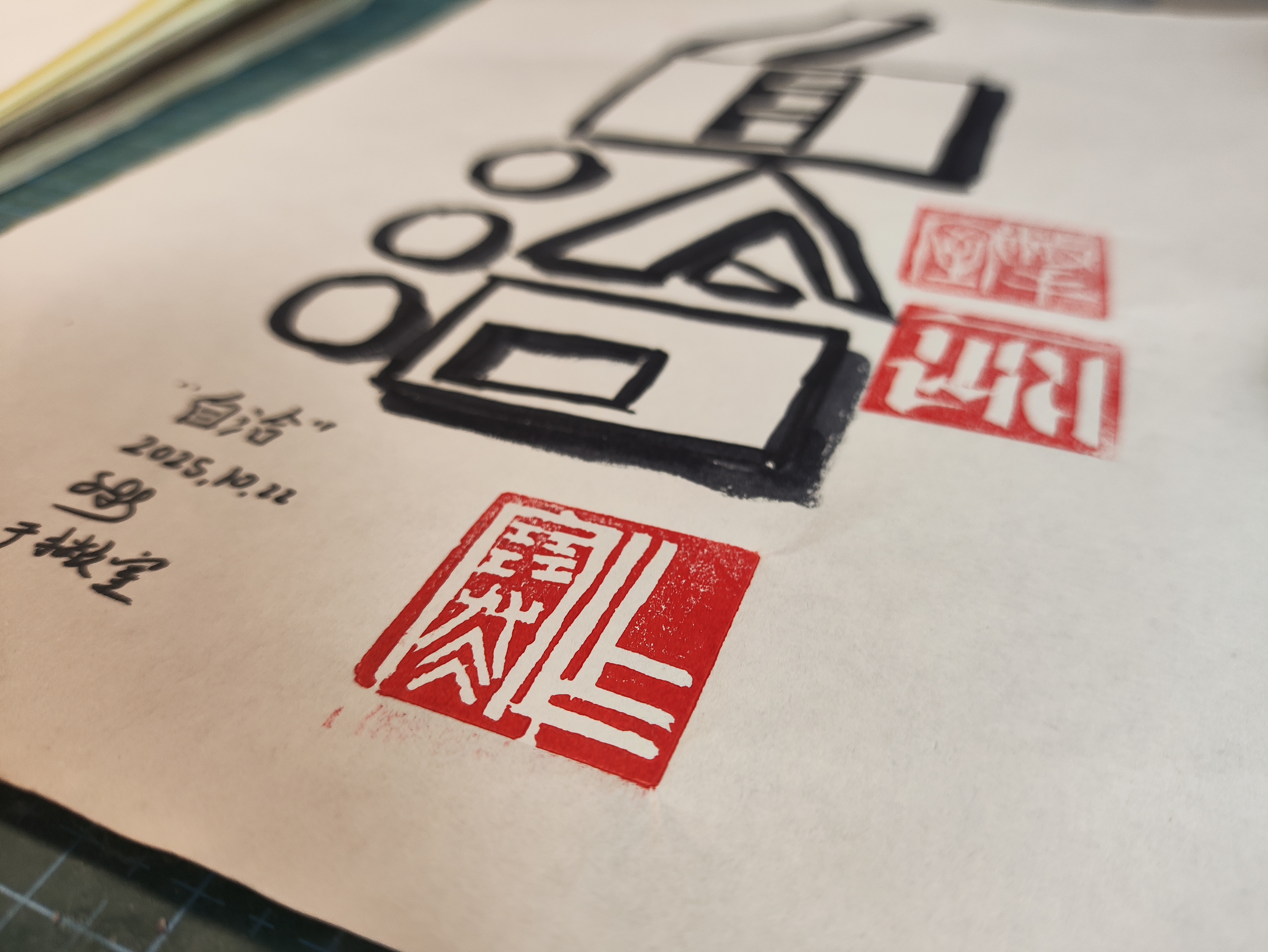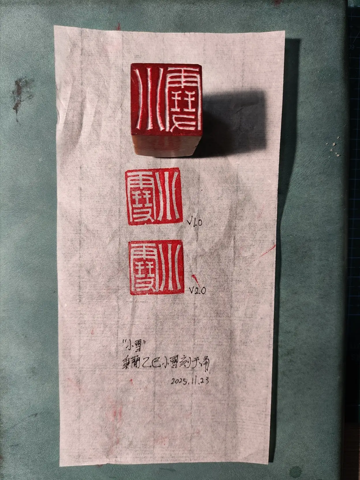 虽说内容(刀法)与样式(设计)完全融合,却所见非所得,结果要用印泥编译(铃印)出来。过程不能撤销,基本没有太多回旋余地,刻地好好的,印石一崩,刻刀一滑,说废就废。(不过我一般不予理睬,美其名曰“手工感💀”)