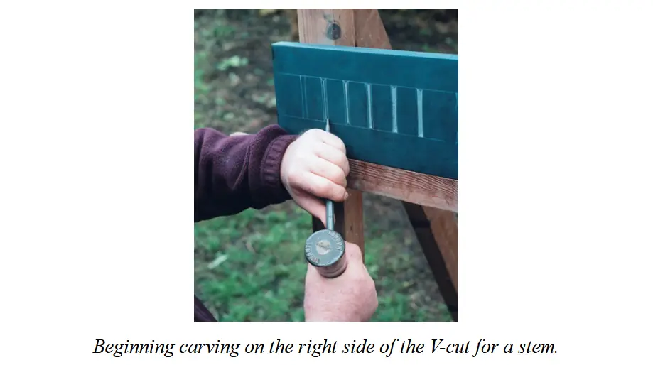 “从一个行程的一端到另一端的雕刻被称为 “经过(‘pass’)”,要雕刻一个完整的 V 形截面,必须在行程的两侧交替经过若干次。用凿子轻轻敲击凿头的规律性动作会在石头上留下一个个小台阶、其规律性将反映出攻丝的规律性。通过小幅度、有规律的连续敲击可以最大限度地控制凿子,每次敲击的距离大约为 10 毫米(3⁄8 英寸)。”