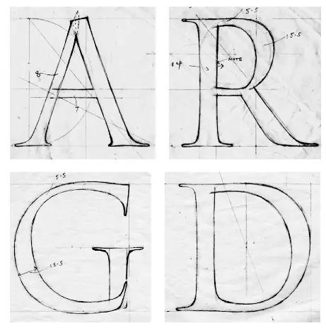 如前所述,罗马字的设计要求非常严苛。字母形状和比例、字干宽度与字母高度之间的关系(简称字重)、字干、粗斜线和细斜线以及曲线之间的相对宽度等等都有明确的要求。可以分成几组来分析其刻制的要点