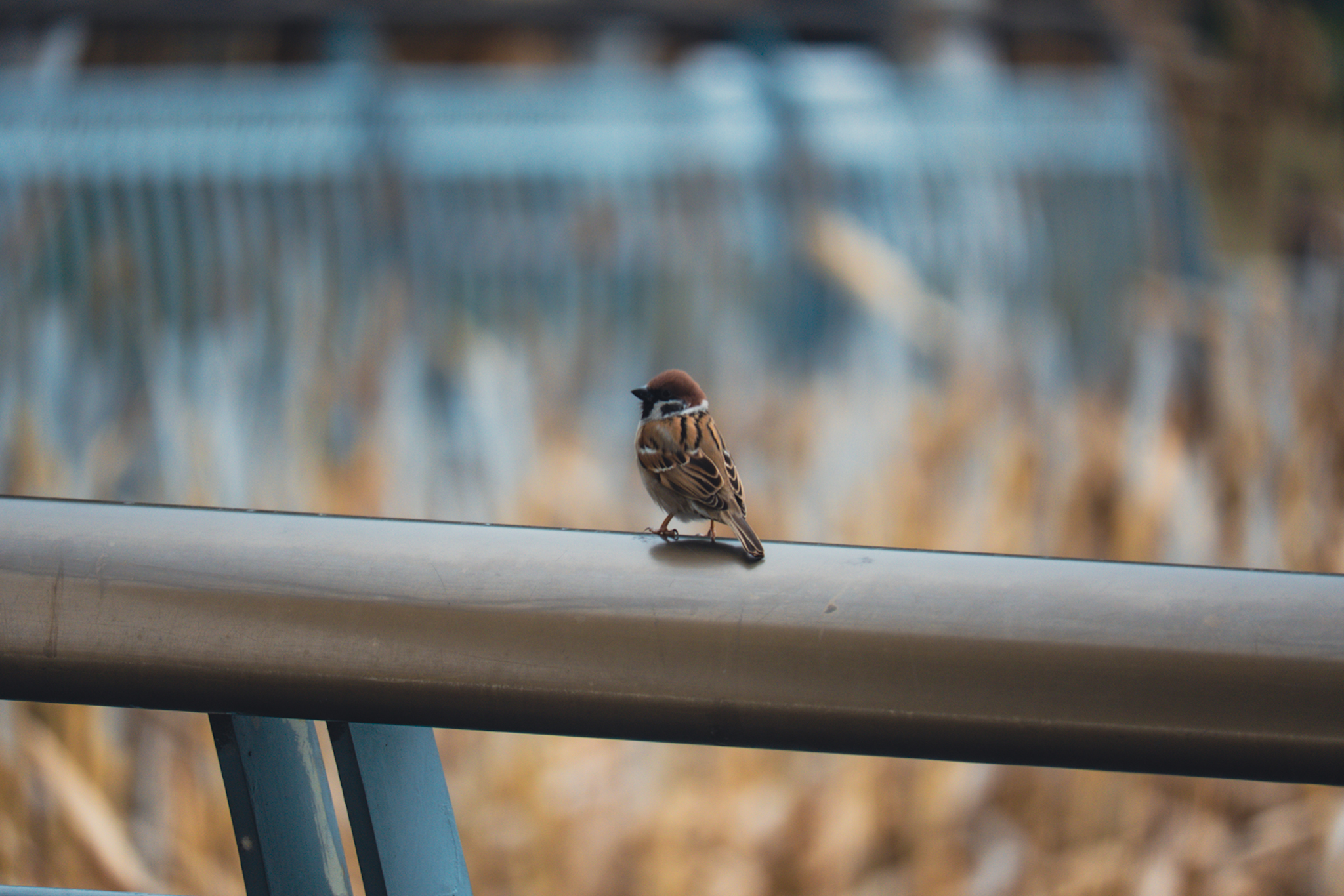 起初是想拍水渠口处的两只白鹤,惊叹特意藏起来慢慢靠近,白鹤的警惕性还是太强,一扑腾飞走了,便只好拍地上的麻雀,结果发现两只个头大的椋鸟,继续靠近后,椋鸟飞到路边电线上不下来,等了好半晌都没动静。那两只鸟看我不走,也放弃下来了,索性安居电线上,竟压起蛋来,春天果然是那个季节。